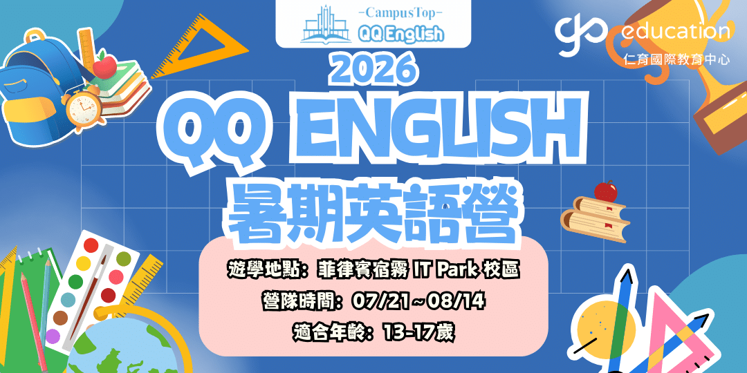 由仁育國際教育 GoEducation 規劃帶隊,2026 年暑假前進菲律賓宿霧,參加 QQ English IT Park 四週夏令英語遊學營。課程採系統化與引導式教學,每日安排 4 堂一對一課程、2 堂團體課、1 堂活動課程與晚自習。從聽、說、讀、寫及文法全面強化英語實力,培養學生自然開口與自信表達。