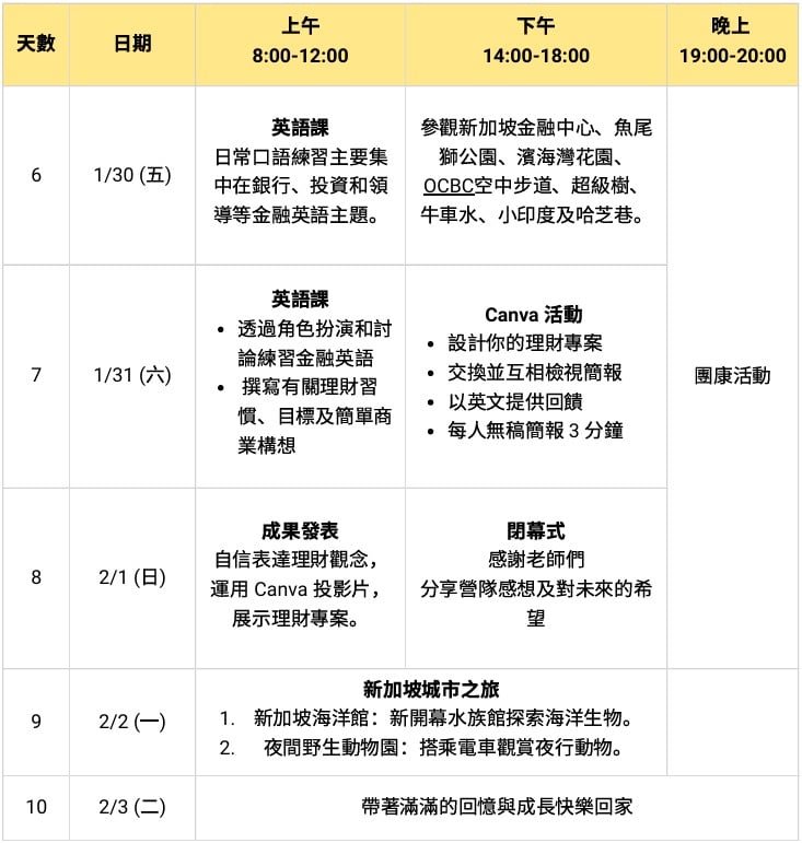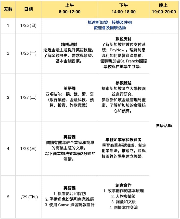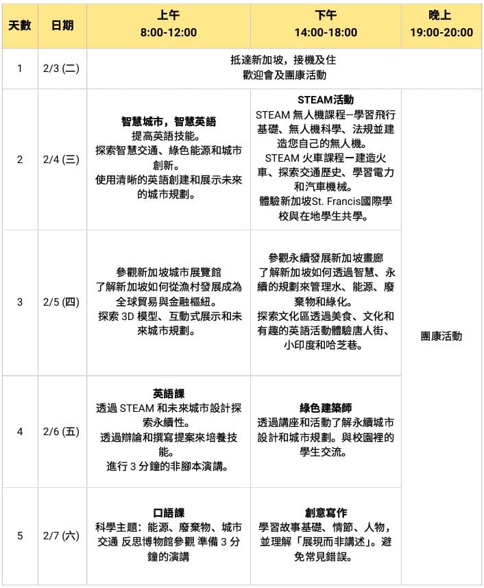 營隊由新加坡專業教育團隊規劃,課程結合理論學習與情境應用,透過專案挑戰、實地參訪與國際合作學習,啟發學生批判思考與解決問題的能力。學員將與國際學校學生共同學習,在全英語的溝通與交流情境中自然培養語言力、自信與國際視野,同時運用 Canva 發表專案、打造個人成果作品集,展現未來競爭力。
