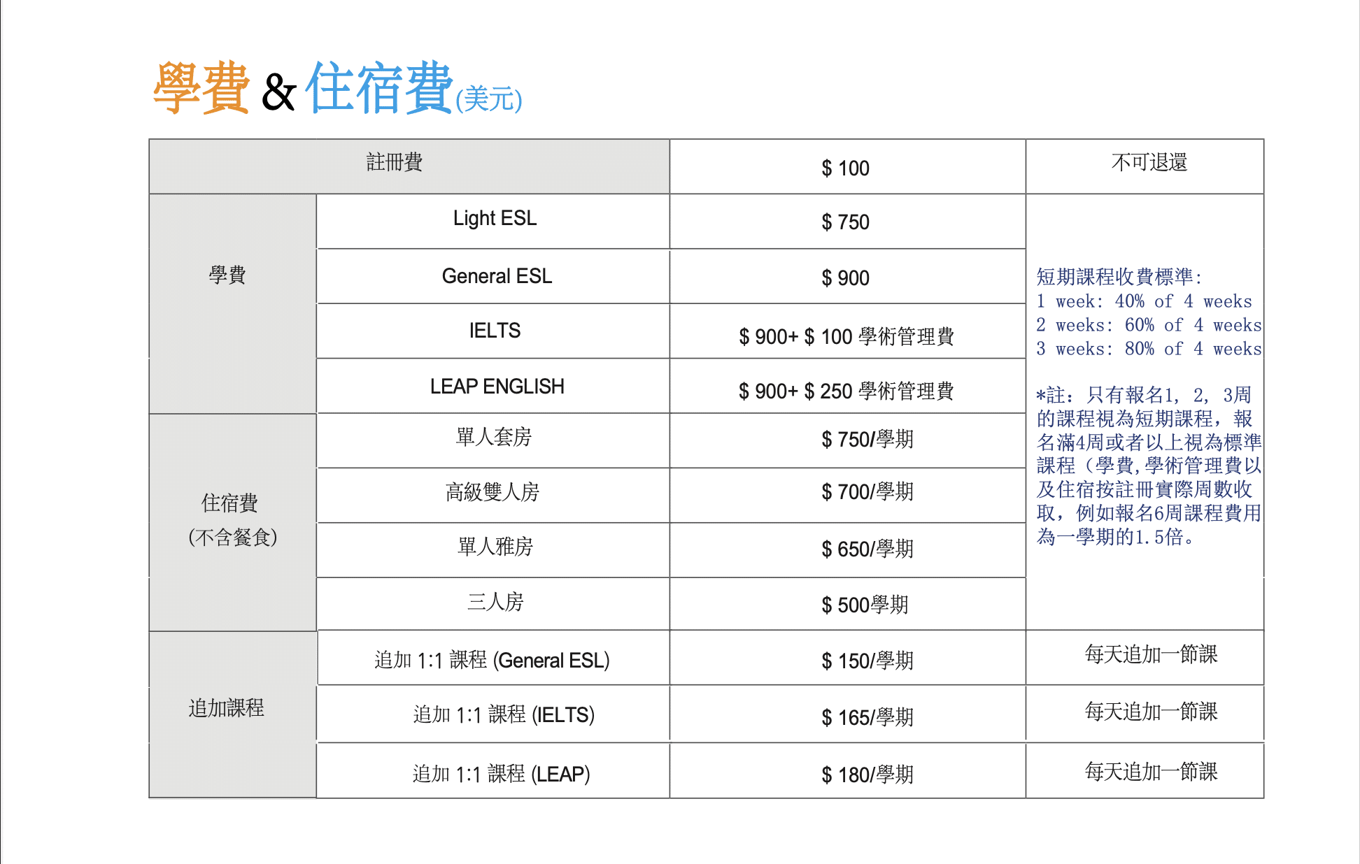 不同課程(General ESL、IELTS、LEAP English)皆有各自固定的課程架構